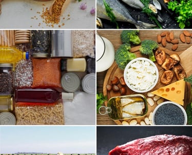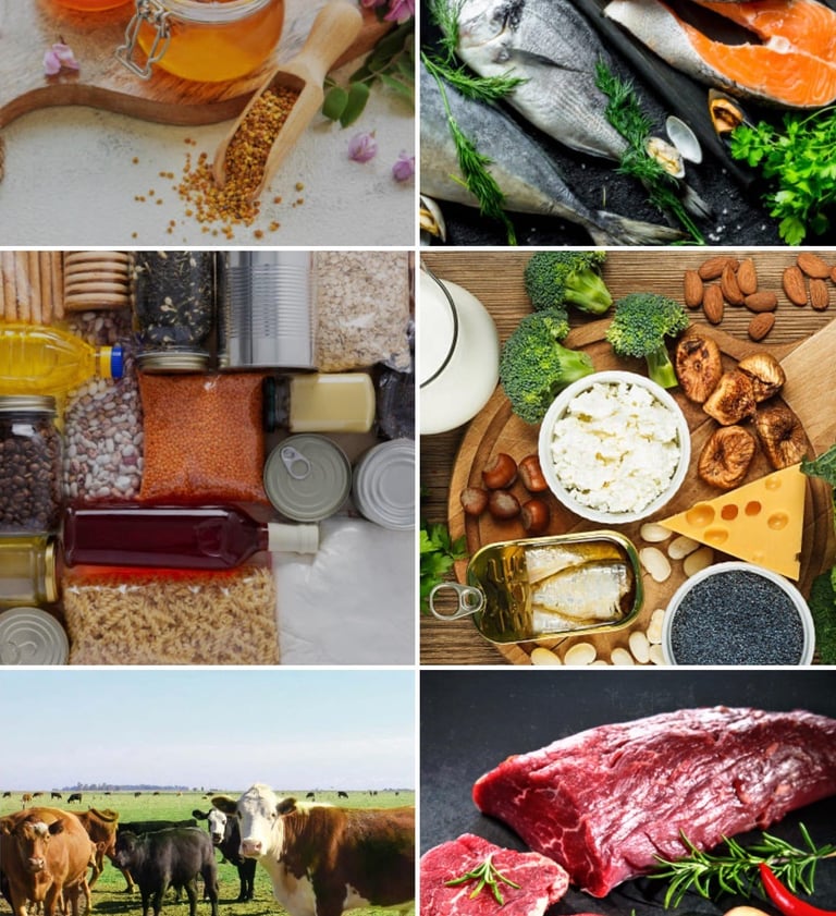 ALIMENTOS Y BEBIDAS: Carnes premium, miel, lácteos, pescados, frutas, condimentos y vinos.